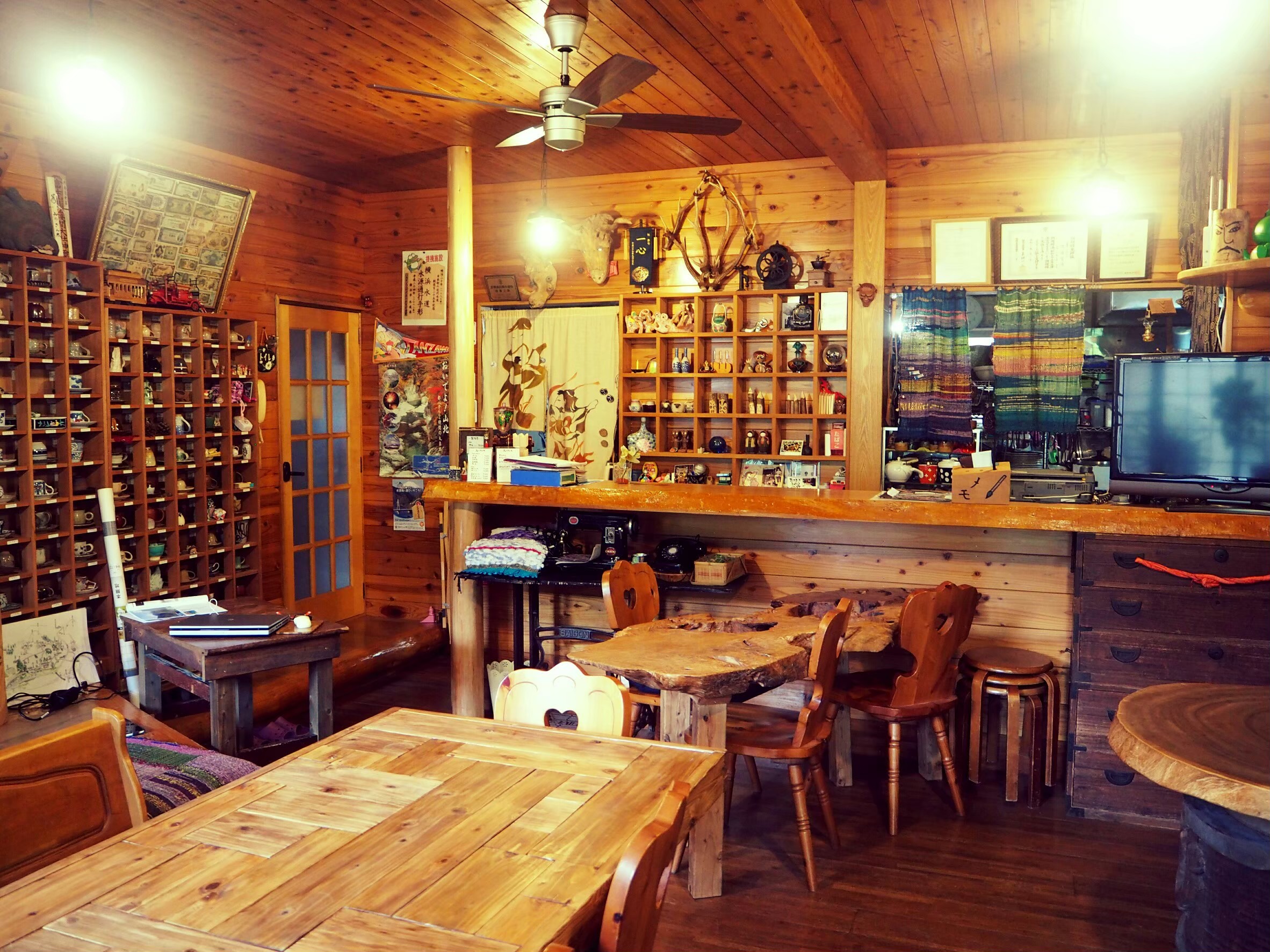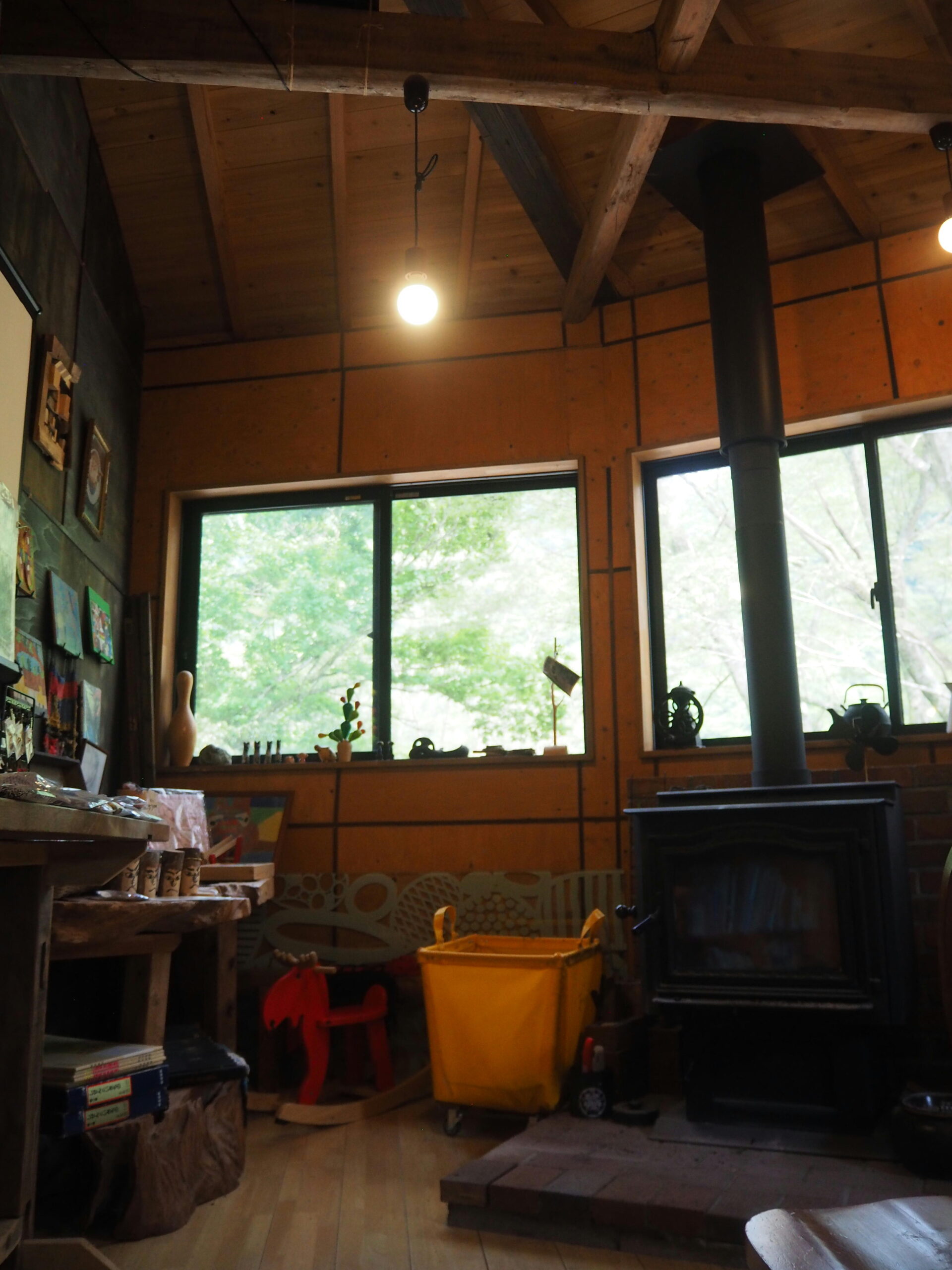 喫茶室からつながる、薪ストーブを囲む空間 地域土産や作品たちが並びます
